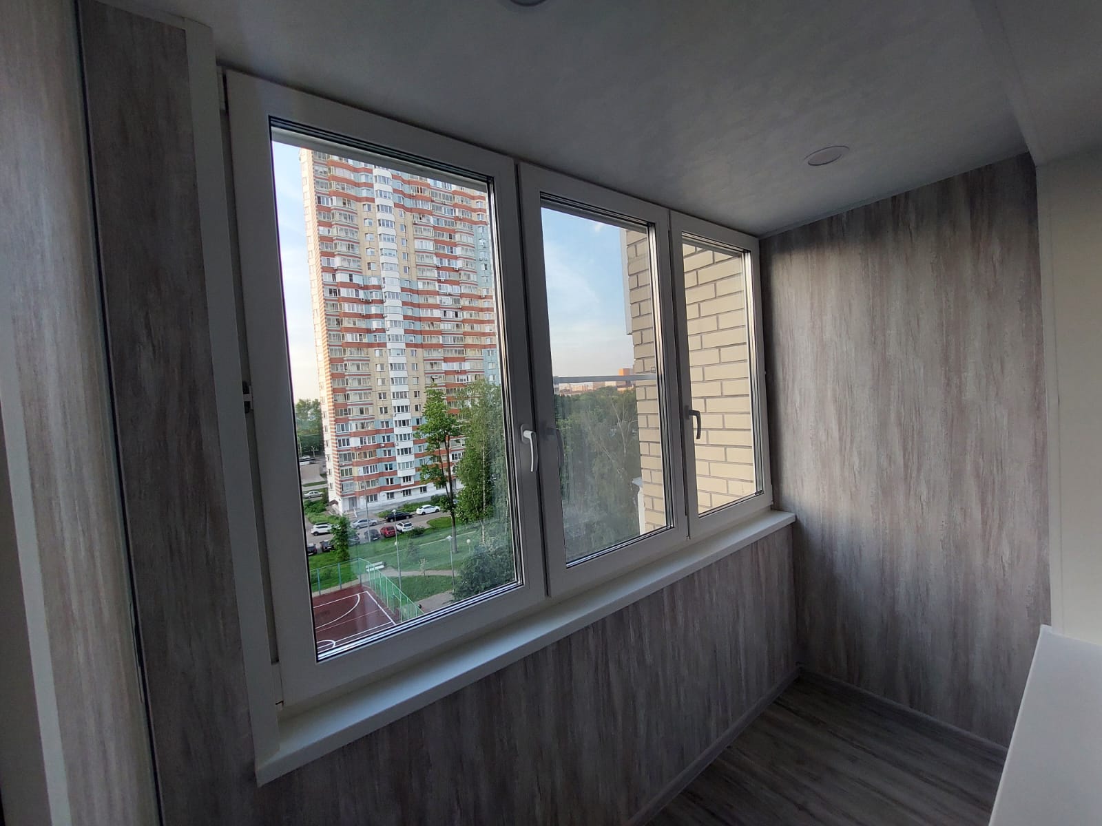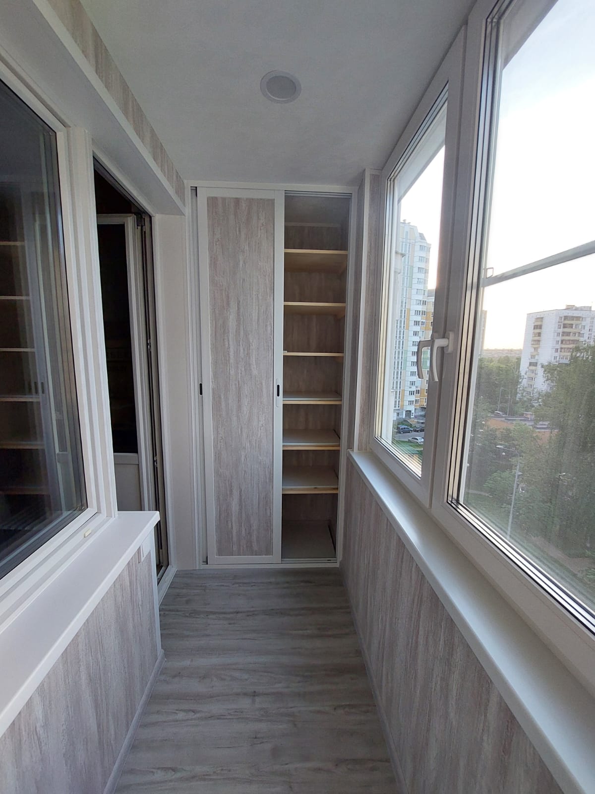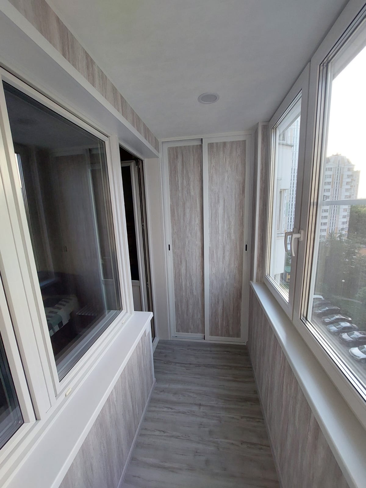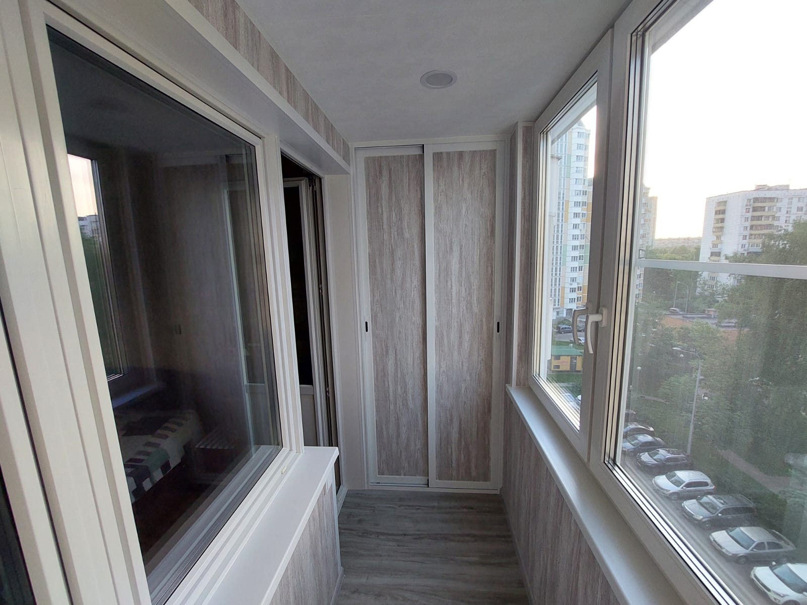 Стандартный трехметровый балкон с утеплением стен и отделкой панелями ПВХ «Дерево розовое». Пол из кварцвинила, на потолке встроенные светильники. И конечно же встроенный шкаф с раздвижными дверцами.
